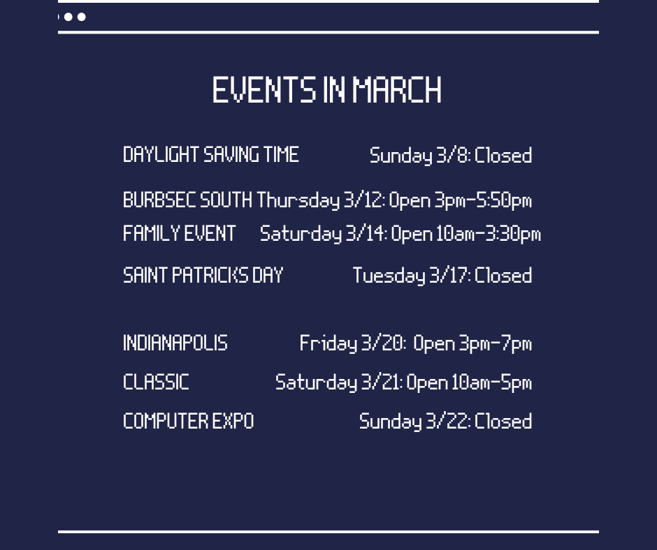 March is bringing a bunch of different events that will be shifting our schedule, keep an eye on our socials so that you can come to the store and shop the sale! We’ll be closing early for Burbsec South on the 12th, and a Family Event on the 14th. At the end of the month, FreeGeek will be setting up a table at the Indianapolis Classic Computer Expo! Come on out to see us there! If you can’t make it that far, but will be in Chicago, you can always still come to the shop since we’ll be keeping it to our normal hours too!
